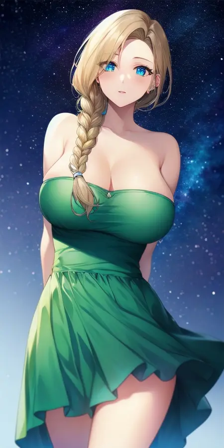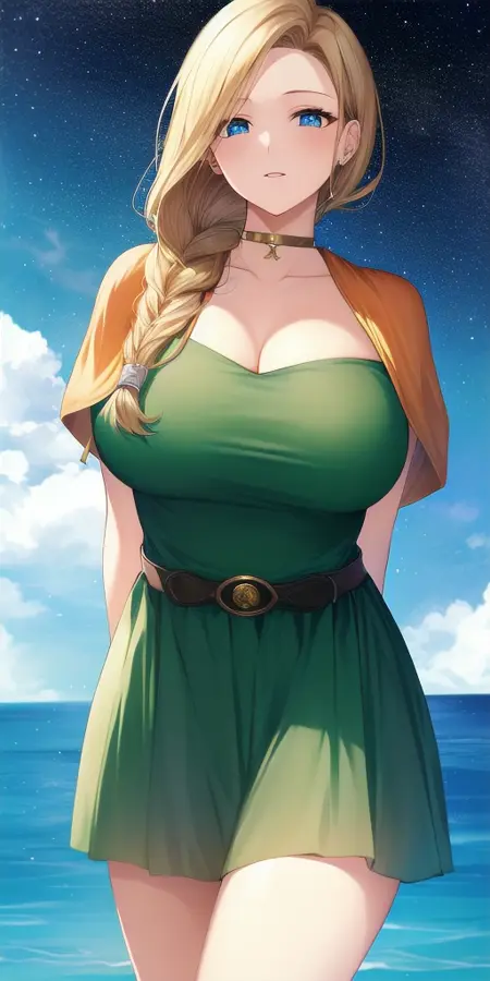 - green_strapless_short_dress_orange_cape_belt_choker:彼女のデフォルト衣装。
