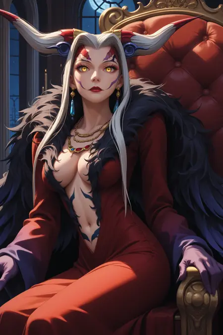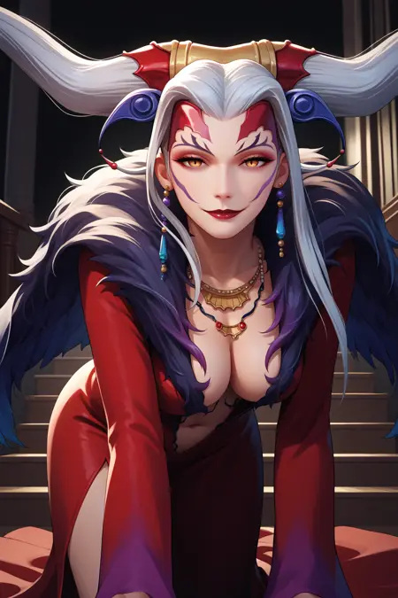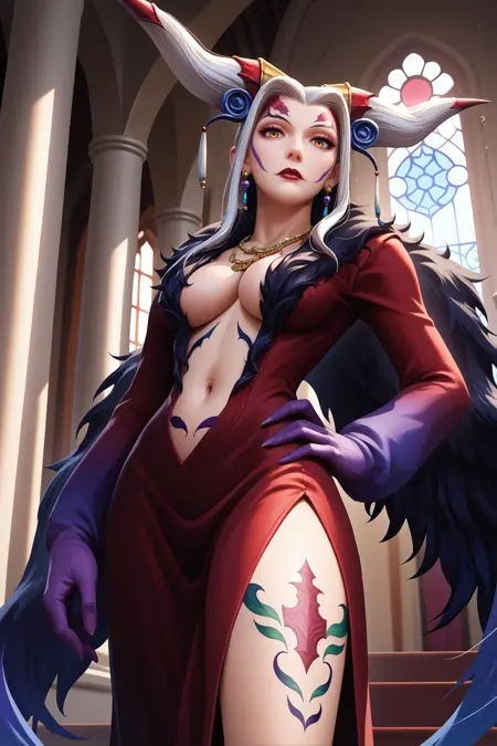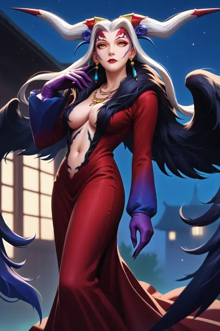 Add "lipstick, earrings, necklace, feather trim, red dress, side slit, fur trim, plunging neckline, cleavage, navel, long dress, black wings" for her typical look.