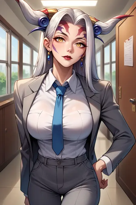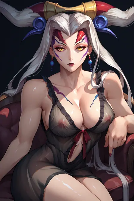 Trigger word is "ffulti" and "yellow eyes, white hair, horns, long hair, facial mark" is required.