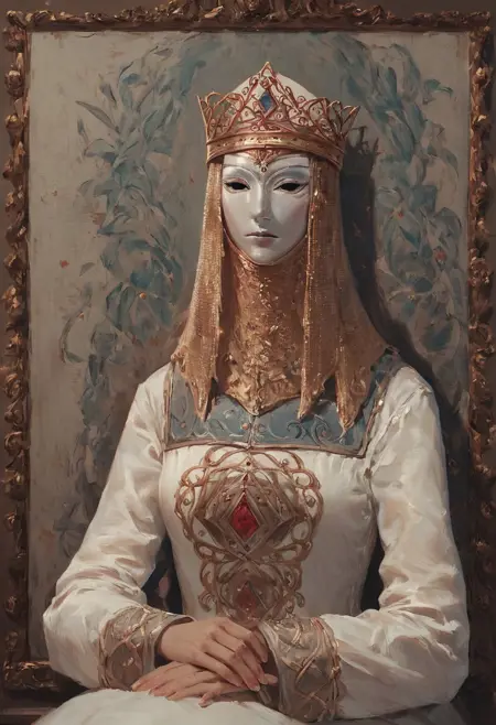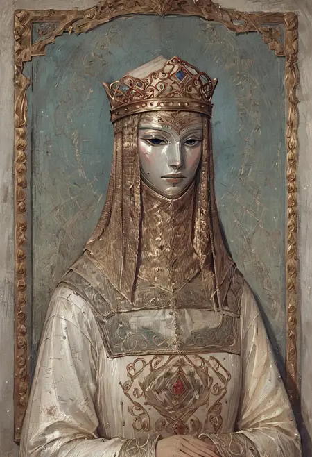 Helpful tags: tanith, 1girl, white mask, crown, white robe, long sleeves, crest, brown boots,