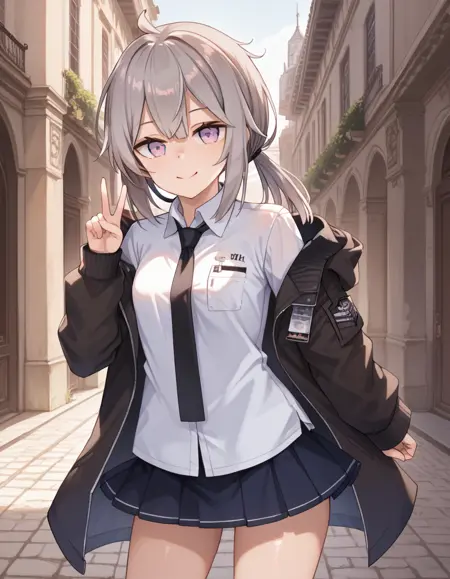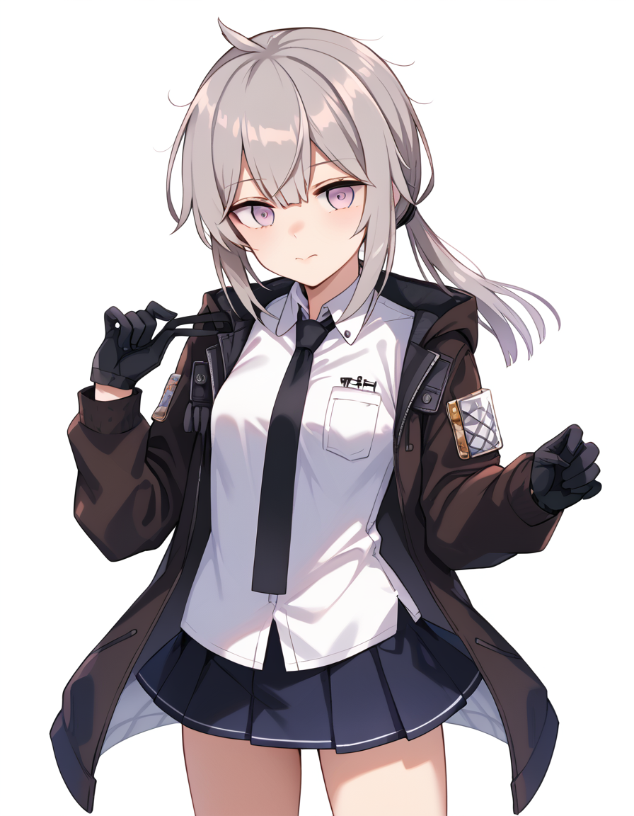 m200def, low ponytail, def shirt, def necktie, def jacket, open jacket, def skirt, def gloves