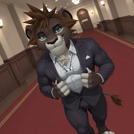 雄性狮子,猫科动物,野性,蓝色眼睛,黄色眼白,刺状头发,链条项链,棕色头发,棕色皮毛,棕色身体,白色皮毛,白色身体,双色身体,双色皮毛,黑色鼻子,胡须,尾巴,尖牙
