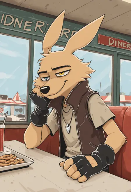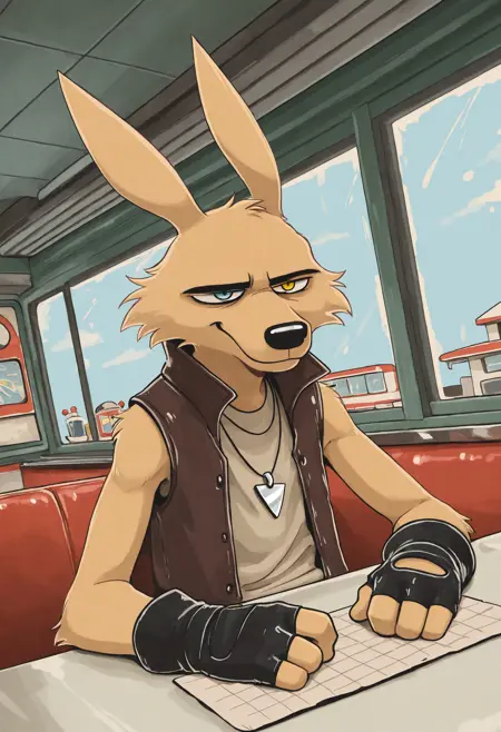 Illustrious: best quality, amazing quality, very aesthetic, absurdres, hires, hank_rider, 1boy, solo, furry, furry male, heterochromia, animal ears, happy, fingerless gloves, shirt, necklace, vest, ...your tags...