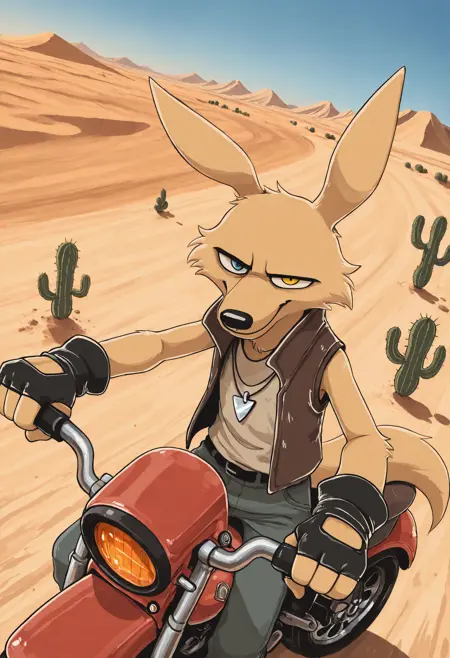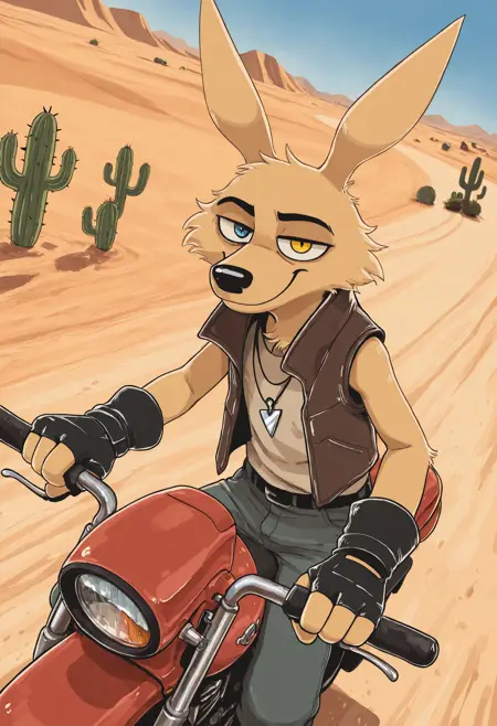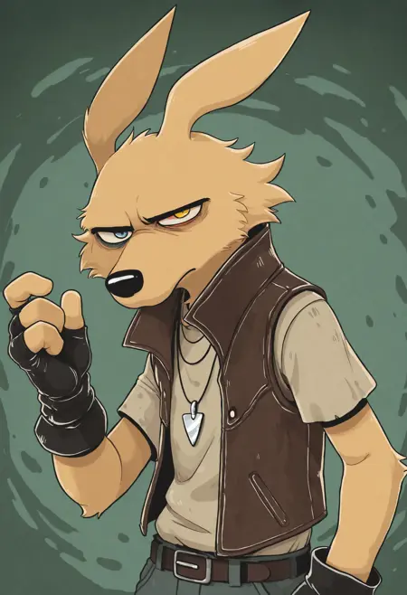 Pony: score_9, score_8_up, score_7_up, high quality, hires, solo, male, coyote, fingerless gloves, vest, heterochromia, ...your tags...