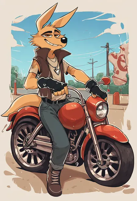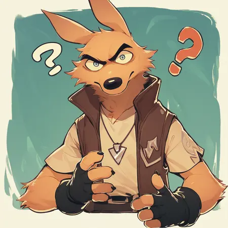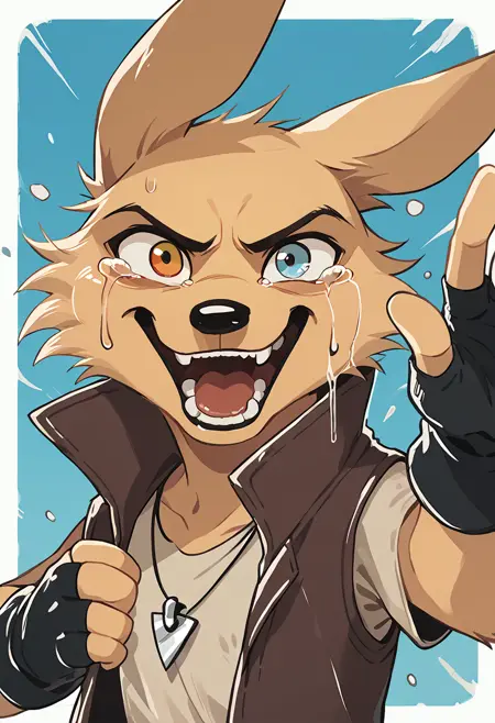 Pony: score_9, score_8_up, score_7_up, high quality, hires, solo, male, coyote, fingerless gloves, vest, heterochromia, ...your tags...