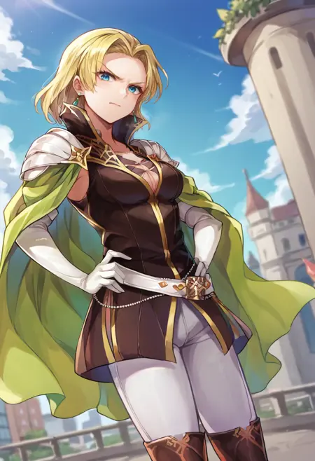 服装1: 绿色耳环、棕色无袖上衣、绿色斗篷、肩甲、露胸、肘部手套、白色腰带、白色长裤、棕色大腿靴,