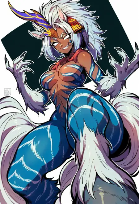 推荐标签:怪物女孩、条纹毛发、灰发、马尾辫、编发、马尾、发光的眼睛、蹄子。