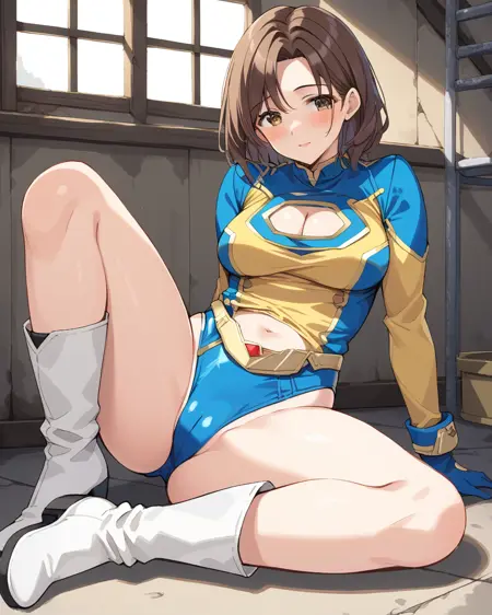 服装: 高开腿,露胸剪裁,白色靴子,腕带,紧身衣,肚脐,紧身,蓝色手套,(可能需要“长袖”)