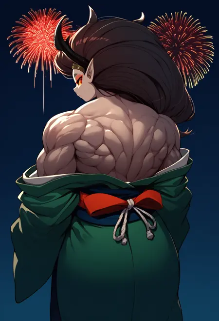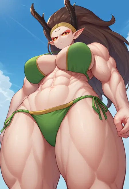 トリガー+外見: muramasaraijin, colored skin, muscular female, abs, thick thighs, makeup, eyeshadow, horns, pointy ears, red eyes, yellow sclera, large breasts