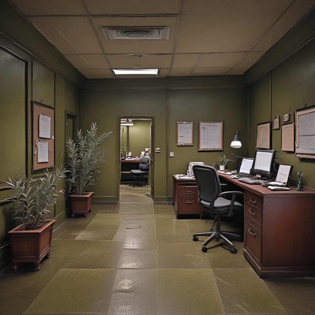 これは、放置された不気味で荒廃したオリーブグリーンのオフィスビル用のアニメLoRAです。限界空間や不気味なシーンの画像に使用できます。