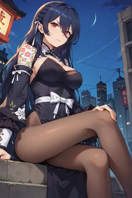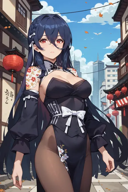 タグ: 濃紺の髪、ロングヘア、横編み、衣装の切り抜き、和風衣装、花柄、外側の袖、白いリボン、茶色のパンスト、黒いドレス