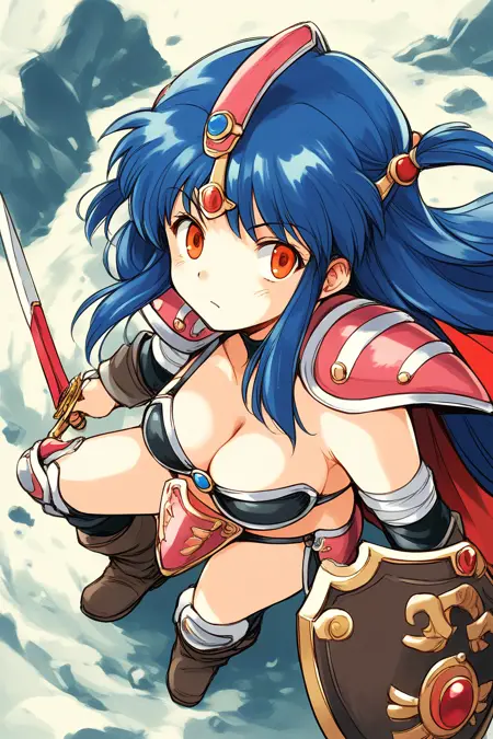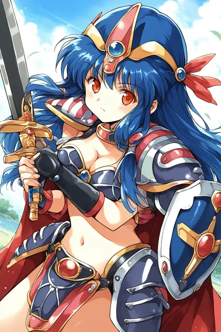 来自甲龙传说维尔加斯特的战士克里斯的LoRA。实际上她是女王,当她穿着城堡中的礼服时,与平日坚毅的形象形成巨大反差,显得格外清纯娴雅,真是个令人惊叹的女孩。她集可爱与美貌于一身,堪称完美的女战士。设计上明显受到《龙珠III》中女战士的影响,身着80年代奇幻题材的经典比基尼盔甲。这种装备常被人质疑“这种真的能防得住吗?”,但在《龙珠》的世界里,魔法比基尼的硬度远超钢铁铠甲,因此我认为这种比基尼盔甲或许也蕴含某种魔法装置,能生成肉眼不可见的防护屏障,从而拥有惊人的防御力。