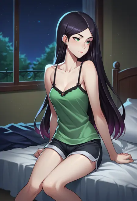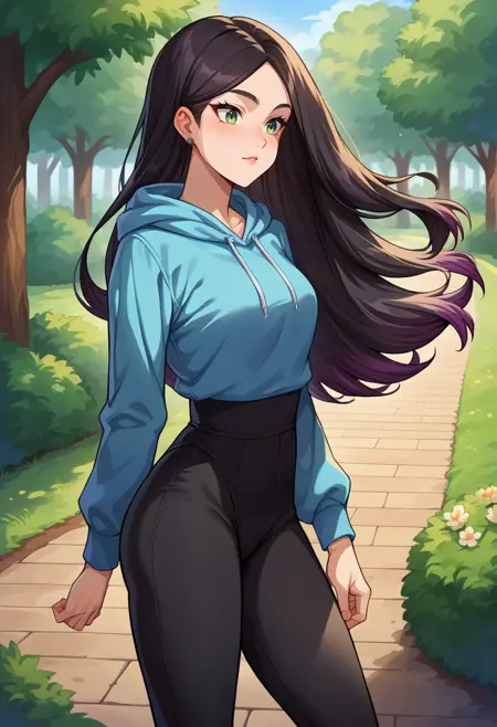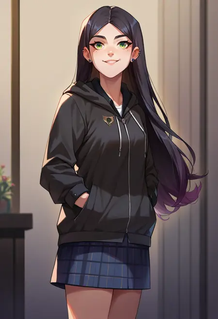Claudia, black hair, gradient hair, long hair, green eyes, earrings