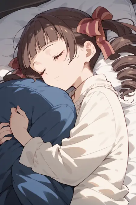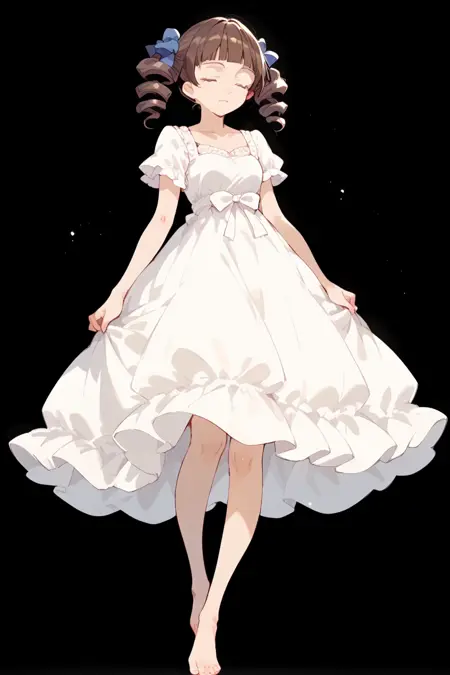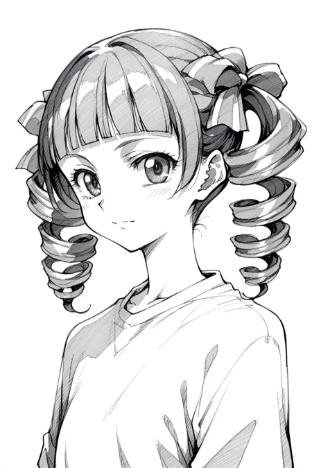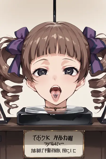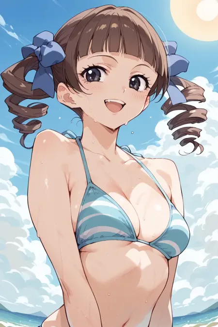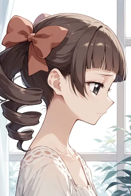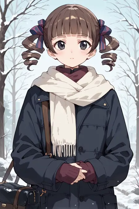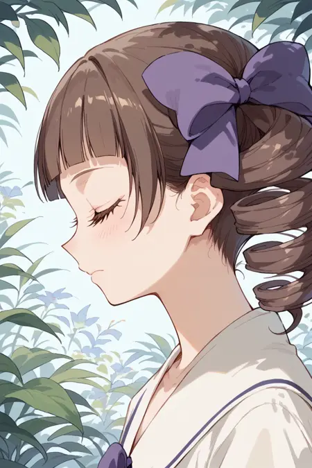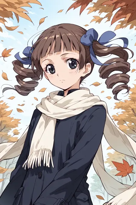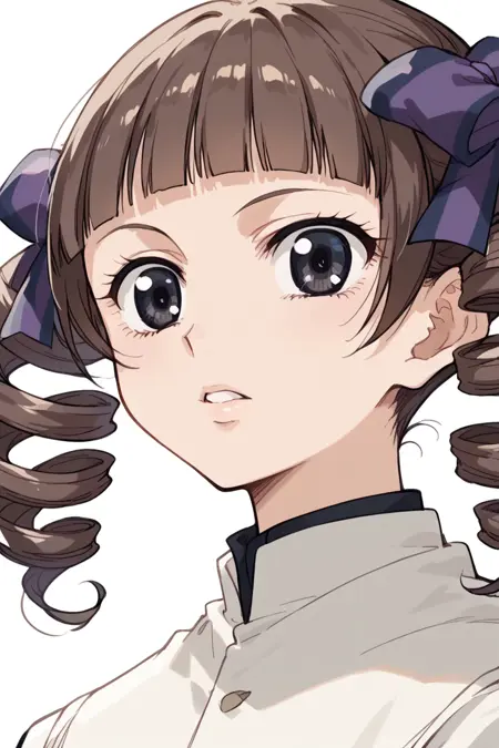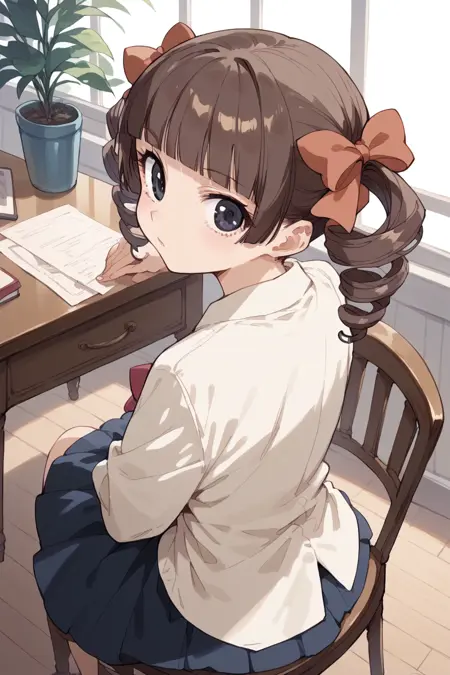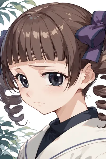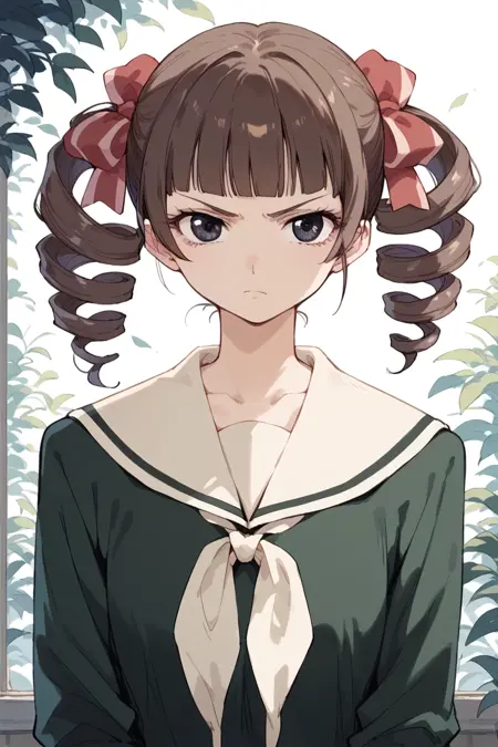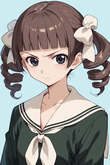 Use Touko, 1girl, twin drills, black eyes, brown hair and school uniform.