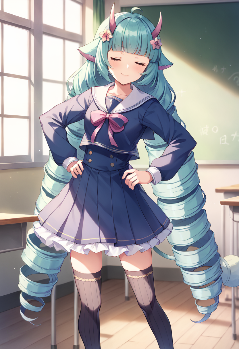school uniform,blue shirt,blue skirt,sailor collar,long sleeves,pink bow,black thighhighs