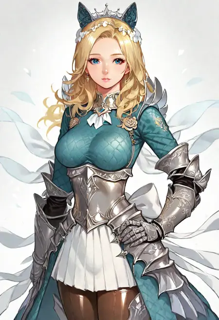 delia_(mabinogi), delia_outfits_1, 1girl, solo, armor, blonde hair, gauntlets, fake animal ears, blue eyes, armored dress, thighhighs, greaves, knight, long hair, armored boots, boots