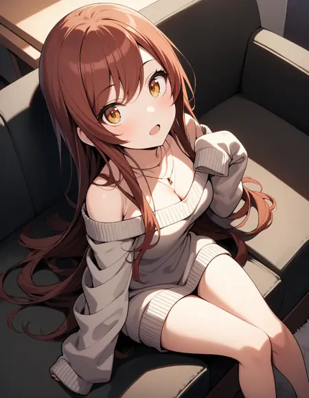 a_osaki, 1girl, solo, long hair, brown hair, brown eyes, yellow eyes, swept bangs, small breasts