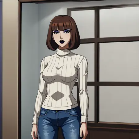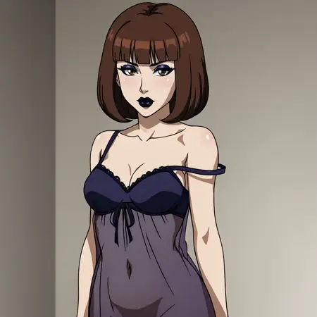 - 자켓 트리거: asathehealercoat, 1girl, medium breasts, cleavage, hat, brown hair, lipstick, makeup, black lips, dress, nurse cap, short hair, bob cut, blunt bangs, jacket, nail polish, choker, cross, black nails