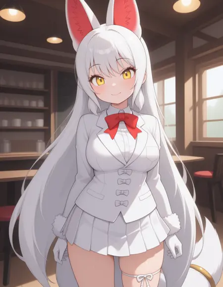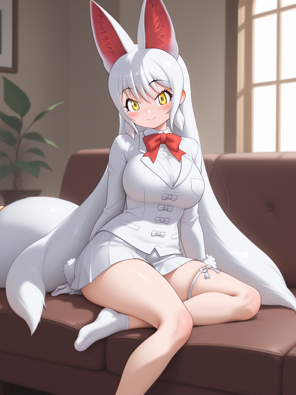 [外観] oinari-sama \(kemono friends\)、狐の少女、狐の尾、尾、狐の耳、動物の耳、動物の耳のふわふわ、追加の耳、白髪、長い髪、非常に長い髪、黄色い目、
