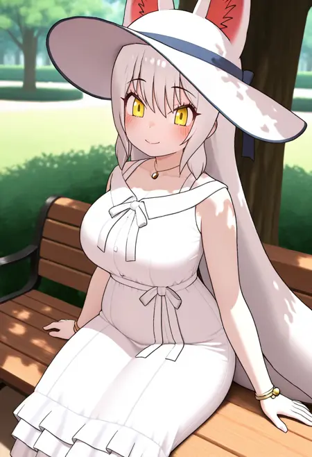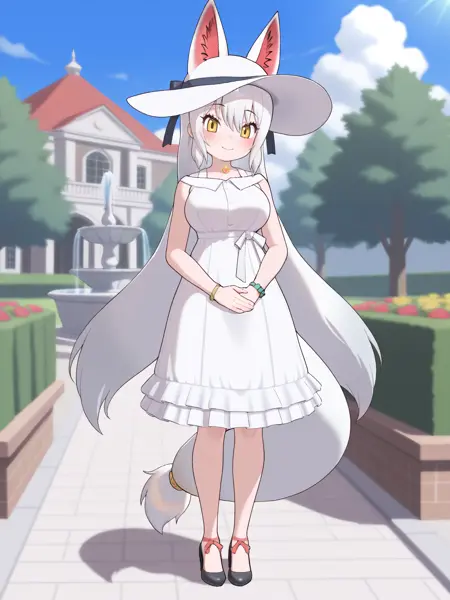 [Alternate Costume] oinr2nd, sun hat, white hat, ears through headwear, ribbon, dress, sundress, white dress, sleeveless dress, bare shoulders, jewelry, bracelet, shoes, low block heels, black footwear, footwear ribbon,
