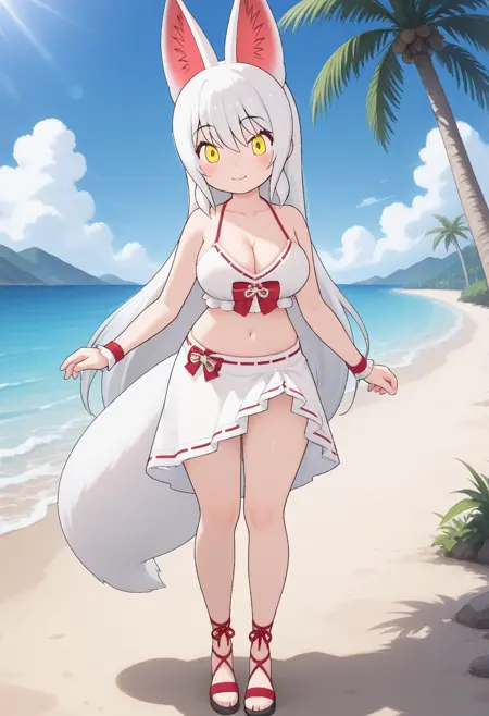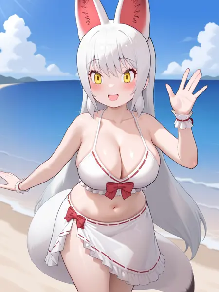 [Appearance] oinari-sama \(kemono friends\), fox girl, fox tail, tail, fox ears, animal ears, animal ear fluff, extra ears, white hair, long hair, very long hair, yellow eyes,