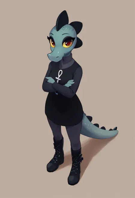 태그: Bea santello, scalie, 청록색 피부, 악어, 노란 공막, 빨간 동공, 검은 드레스, 긴 소매, 안크, 검은 부츠,