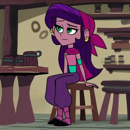 marcella_lq, purple hair, long hair, earrings, bandana, green eyes, pants