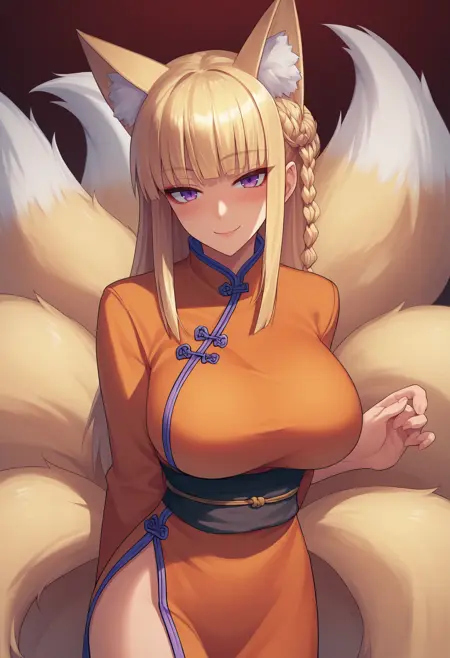 Youko,紫眼睛,狐狸耳,狐狸尾,多尾,金发,发辫,长发,大乳房,中式服装,橙色长裙