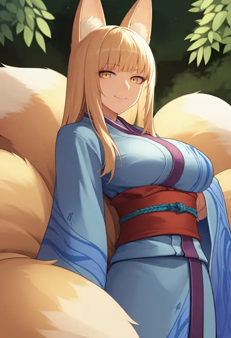 Inari,黄眼睛,狐狸耳,狐狸尾,多尾,金发,长发,大乳房,蓝色和服,腰带,足袋,腰带