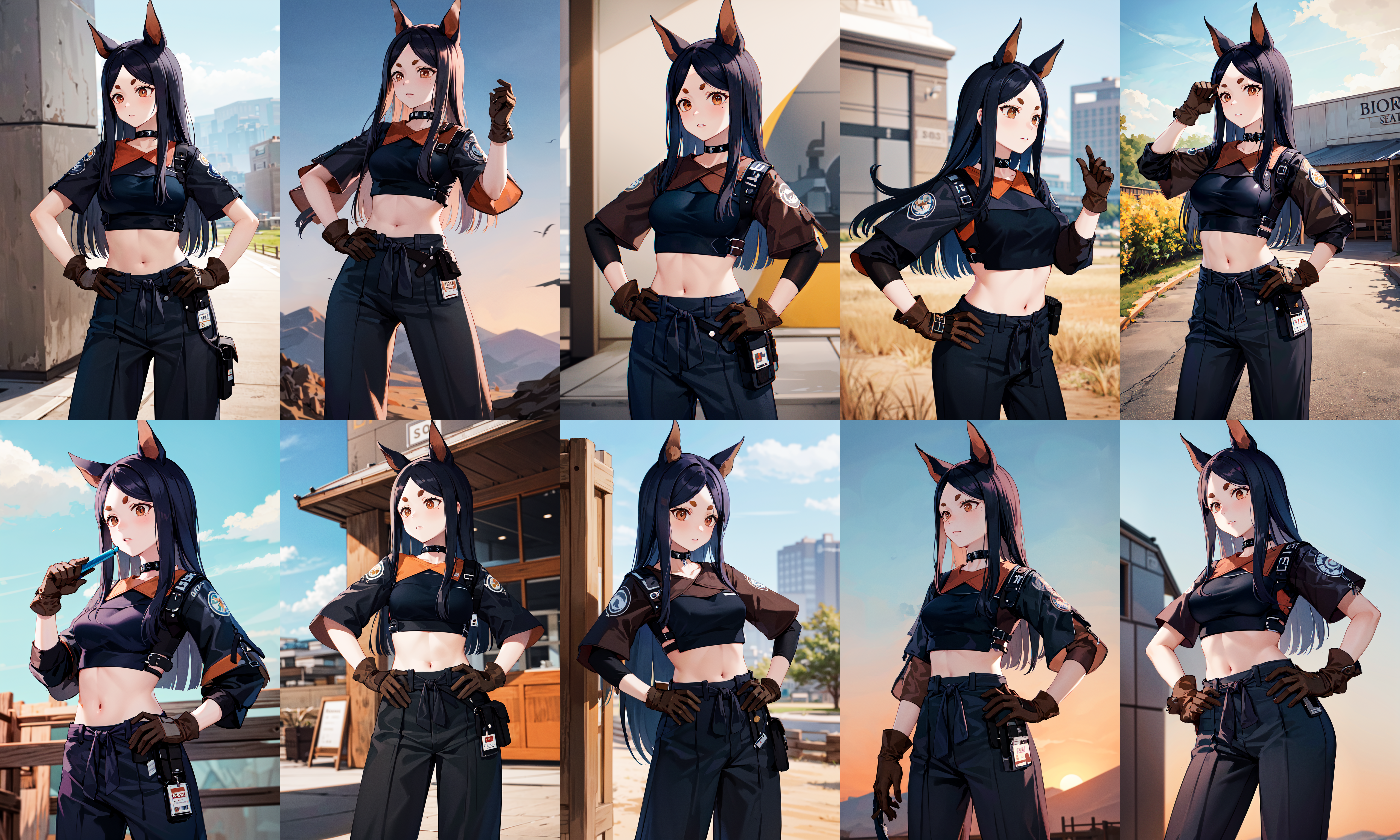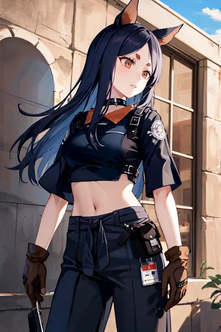 outfit1dob1, 长发, 动物耳, 浓眉, 短上衣, 棕色手套, 腹部暴露, 黑色衬衫, 黑色颈圈, 黑色裤子