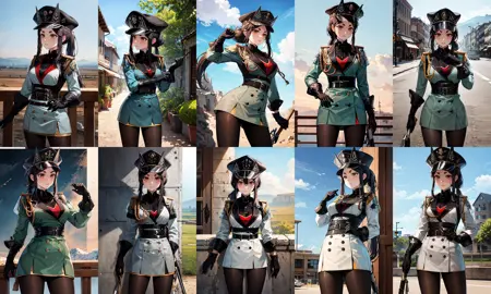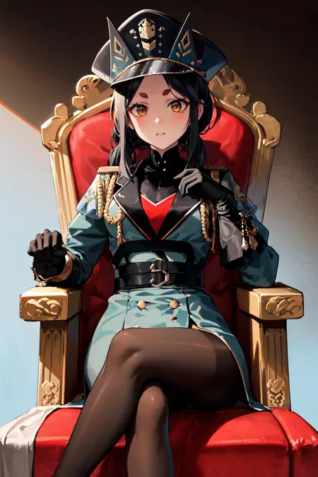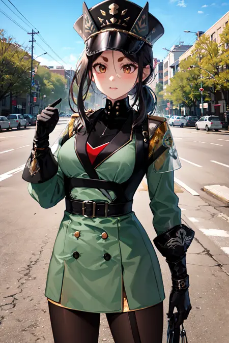 dob1, 长发, 浓眉, 马尾辫, 军装, 黑色手套, 黑色头饰, 帽子, 侧边发辫, 丝袜