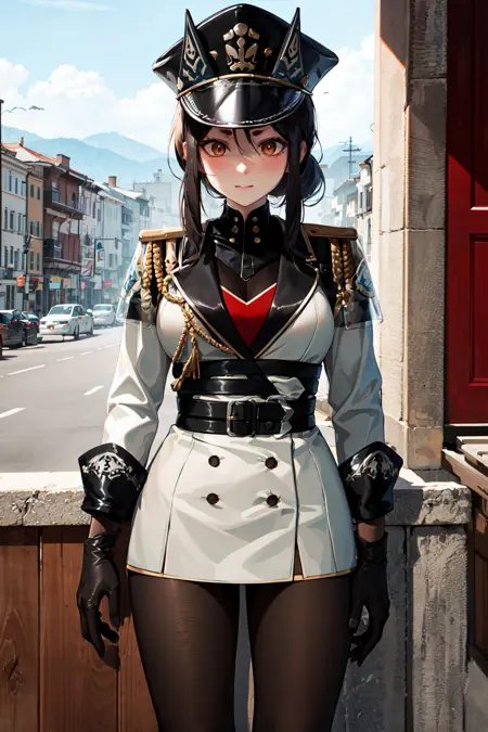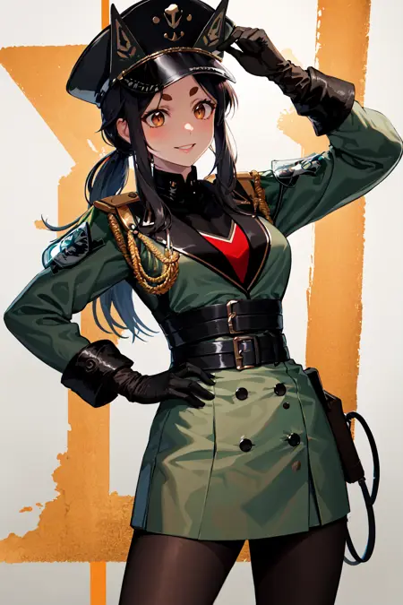 outfit2dob1, 长发, 浓眉, 马尾辫, 军装, 黑色手套, 黑色头饰, 帽子, 侧边发辫, 丝袜