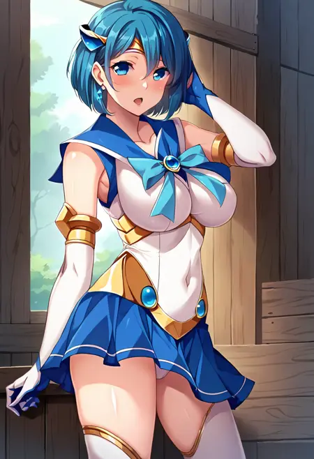 服装1: 白色紧身衣, 蓝色水手领, 肘部手套, 蓝色手套, 青色蝴蝶结, 蓝色胸针, 蓝色短裙, 白色过膝袜