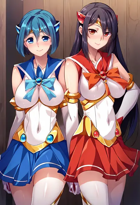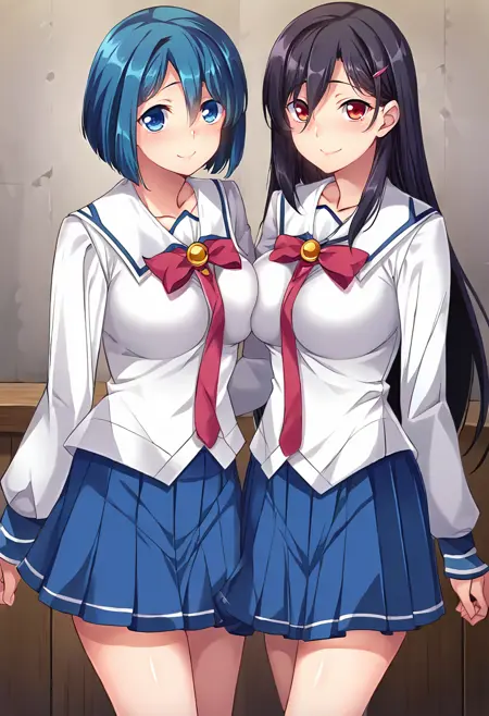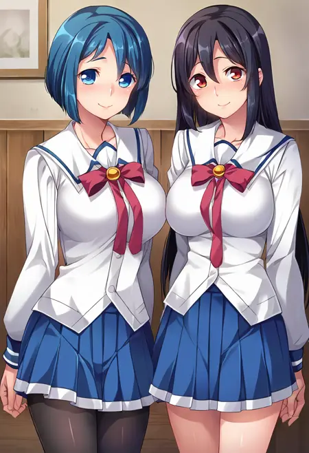 score_9, score_8_up, score_7_up, masterpiece, source_anime BREAK 2girls, a0i_kur3, a01, short hair, blue hair, blue eyes, large breasts, white leotard, blue sailor collar, elbow gloves, blue gloves, cyan bowtie, blue brooch, blue skirt, white thighhighs BREAK kur3, long hair, black hair, red eyes, red circlet, white leotard, red sailor collar, red bowtie, red brooch, elbow gloves, red gloves, red skirt, white thighhighs, looking at viewer, indoors, wooden wall, closed mouth, smile,