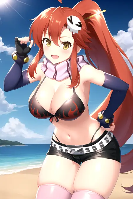 クラシック・ヨコ・リッター:ヨコ、1girl、yoko_littner、red_hair、solo、breasts、bikini、flame_print、long_hair、hair_ornament、large_breasts、ponytail、yellow_eyes、gloves、striped_scarf、pink_legwear、hair_stick、skull_hair_ornament、flame_print、fingerless_gloves、belt。
