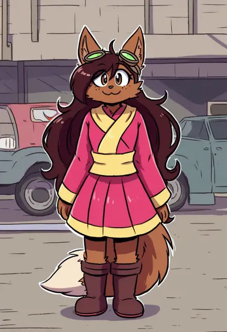 Kanako, reddish-pink kimono, dark red scarf, Long sleeves, yellow obi sash around midriff, Long hair, Goggles, goggles on head, Furry,