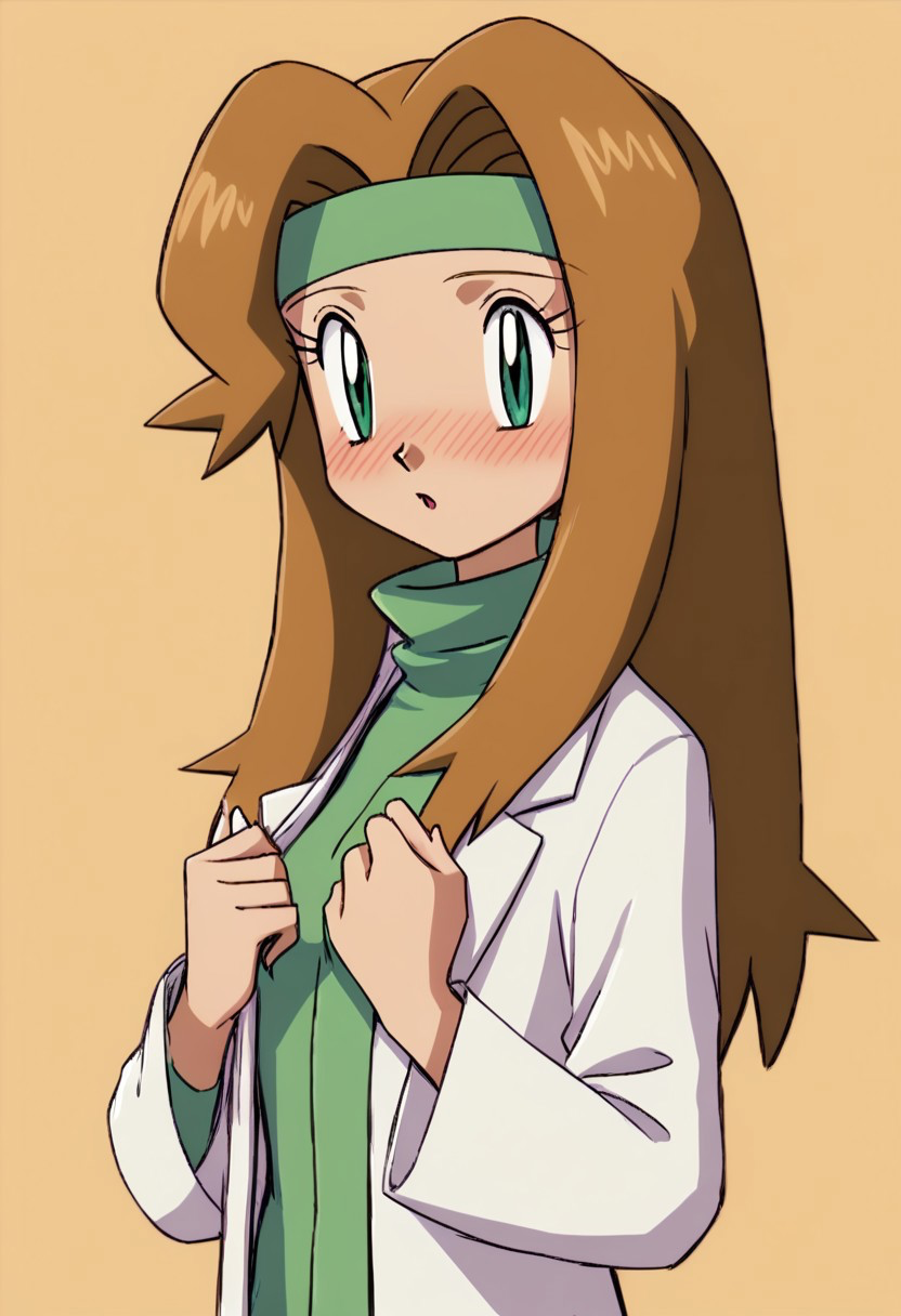 宝可梦中的戴茜·橡,标签:戴茜·橡、绿色发带、绿色连衣裙、白色衬衫、白大褂、棕色头发、长发、绿色眼睛、oekaki