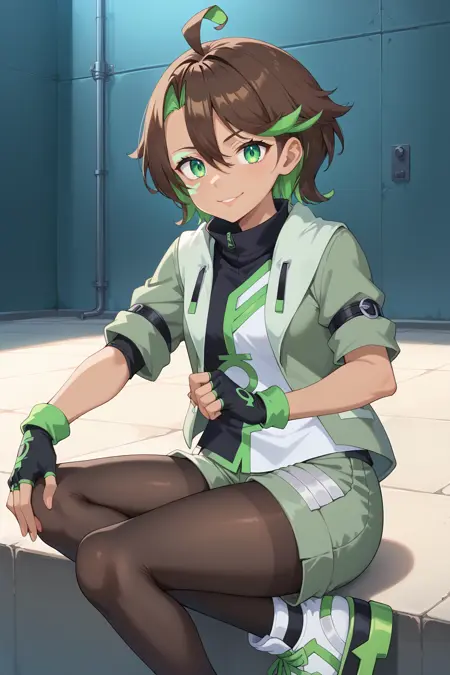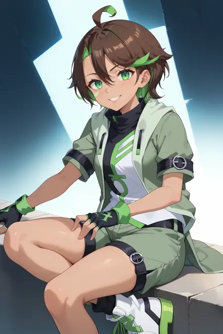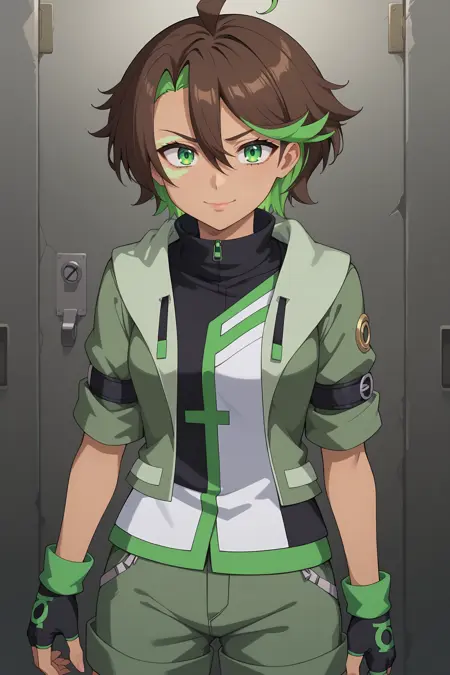 cruzout, shirt, short sleeves, black gloves, fingerless gloves, open jacket, green jacket, green shorts,