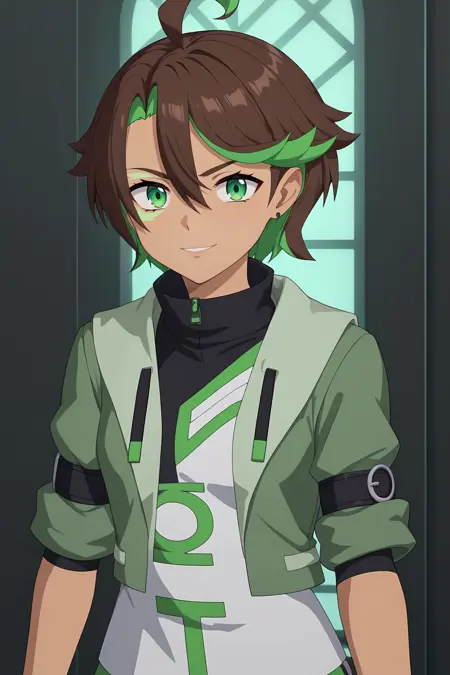 1girl, jessica cruz, green eyes, brown hair, multicolored hair, short hair, hair between eyes, ahoge, dark-skinned female, facial mark,
