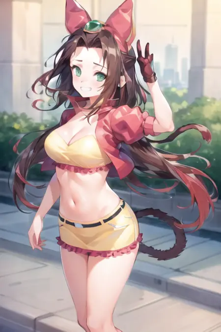 _sthsara、額、長髪、茶髪、緑目の、ピンクの頭飾り、猫の尾 を使って彼女を召喚。_red gloves、red jacket、crop top、yellow skirt、pencil skirt、frilled skirt、belt、red boots を使って彼女のデフォルトの衣装を召喚。必要に応じて省略。