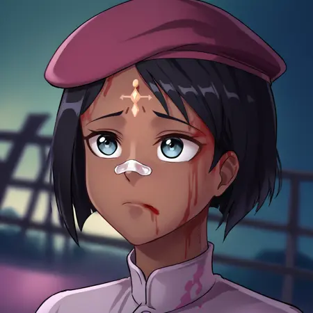 オプション:夜、ダークで紫の照明、口を閉じた、ポートレート、鼻に絆創膏、顔に絆創膏、ぼやけた背景、顔に血