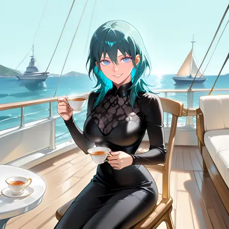 outdoors, day, ocean, ship deck, wooden floor, railing