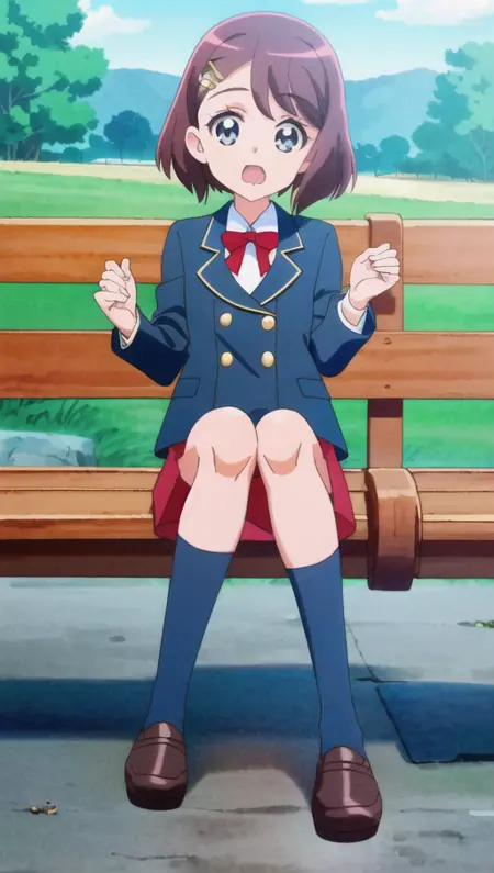 예시 입력(학교 교복) (masterpiece), best quality, (cel anime), highest quality, ((high detail:1.2)), (HDR), (cinematic light:1.1), highres, (fingers 5 fingers:1.2), (little girl), (ultimate cute girl), highres, 1girl, solo, (full body), (한다에라 노도카), hair ornament, hair flower, (노도카스쿨01:1.2), loafers, (kneehighs:1.5), blue sky, park,lora:nodoka\_hanadera\_v1:1.2