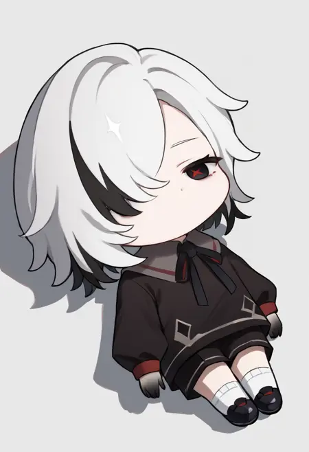 Smol Peruere 的服装:黑色上衣、黑色短裤、长袖、白色袜子、黑色鞋子、颈带