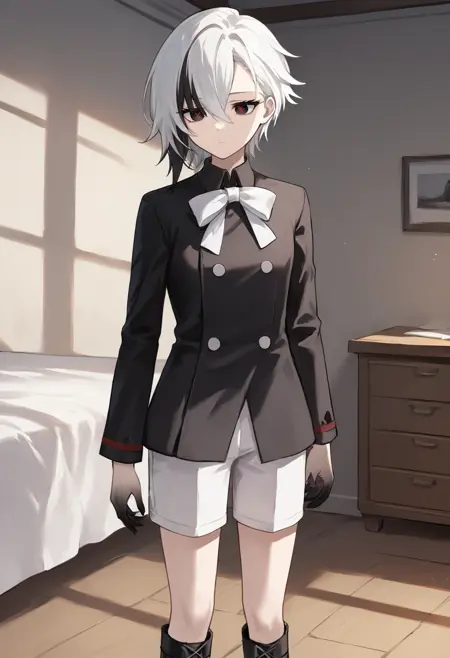 Teen Peruere 的服装:黑色夹克、白色短裤、长袖、白色蝴蝶结、及膝靴