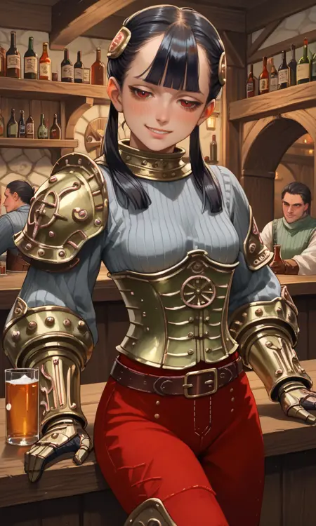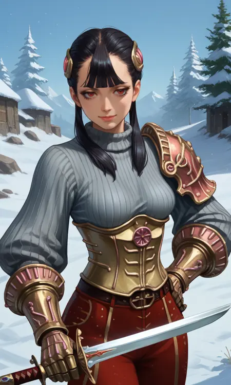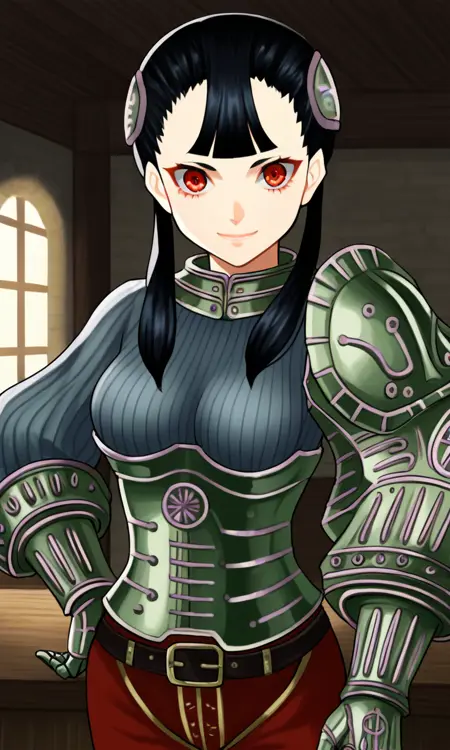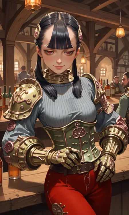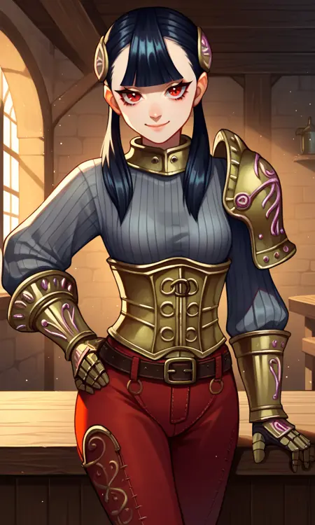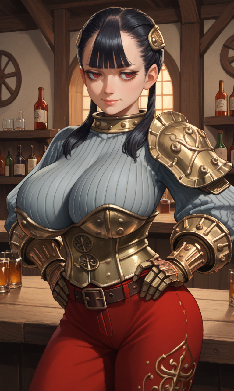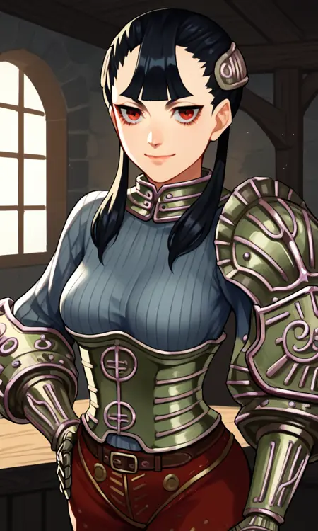 | トレーニングワード | Ashei, armored collar, armored corset, belt, black hair, blunt bangs, boots, gauntlets, hair ornament, long hair, single pauldron, (red eyes), red pants, (grey ribbed sweater), shoulder armor, jitome, twintails, vambraces, long eyelashes, half-closed eyes:0.7コピーしました! |