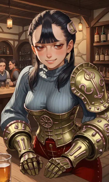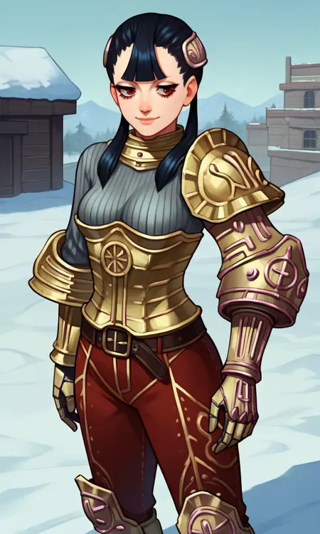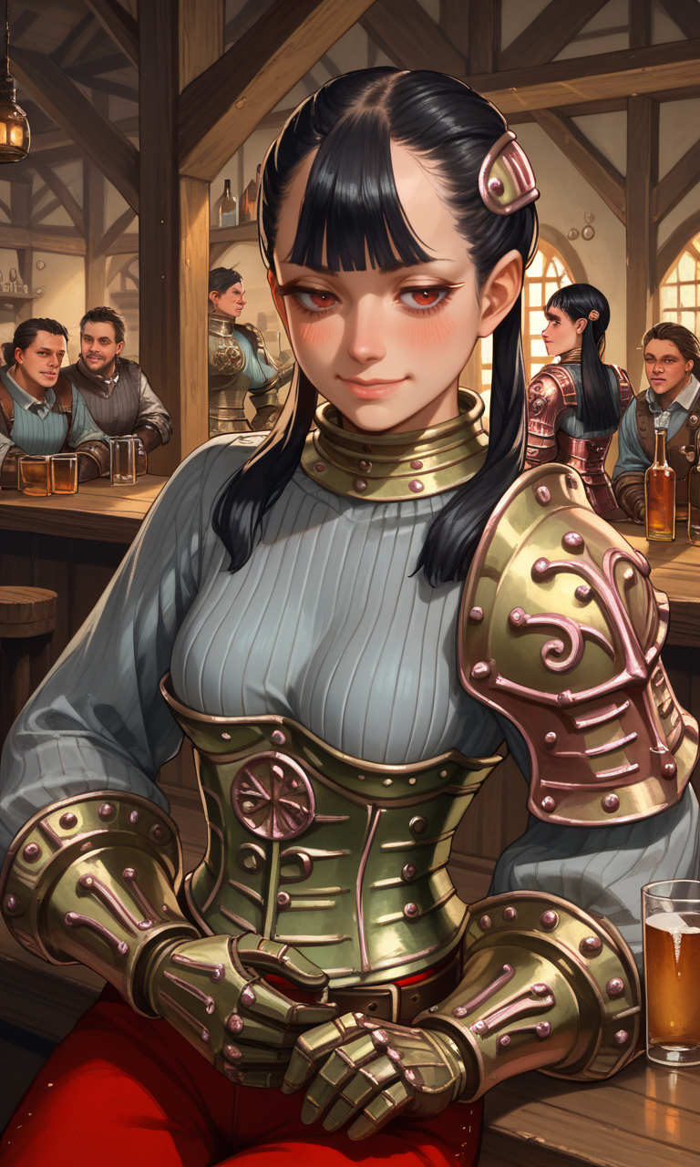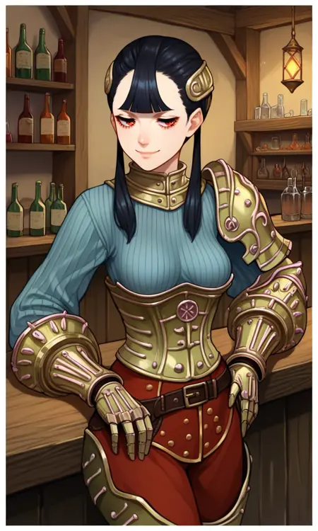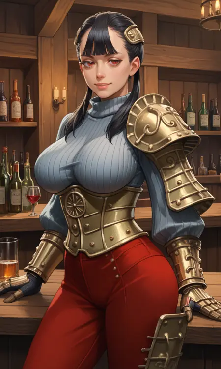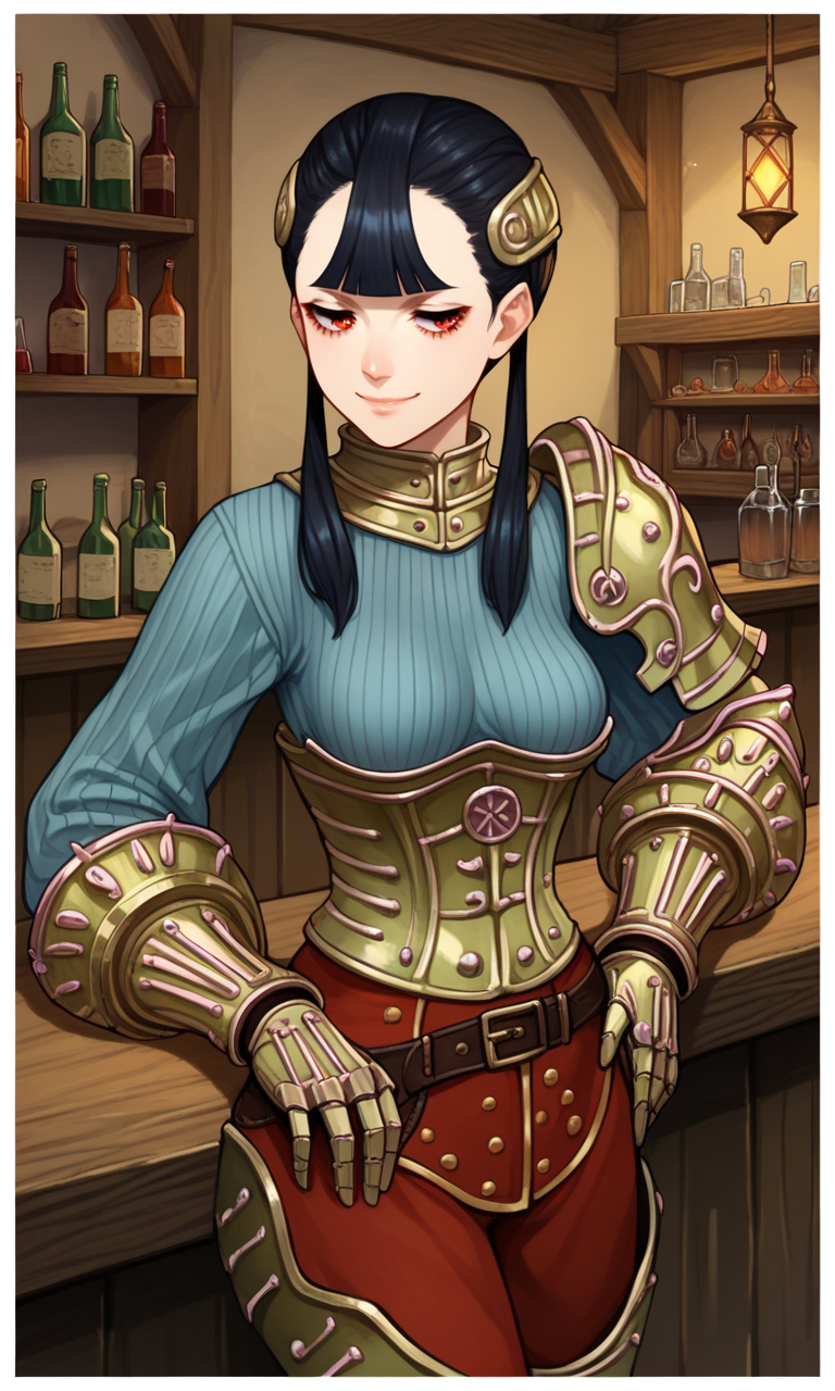 | トレーニングワード | Ashei, armored collar, armored corset, belt, black hair, blunt bangs, boots, gauntlets, hair ornament, long hair, single pauldron, (red eyes), red pants, (grey ribbed sweater), shoulder armor, jitome, twintails, vambraces, long eyelashes, half-closed eyes:0.7コピーしました! |