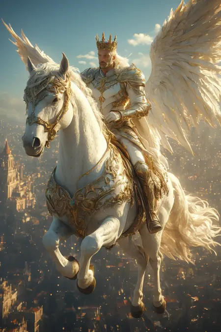 "자세하게 묘사된 갑옷과 헬멧을 입은 악랄한 판타지 악마 왕이, 큰 파란 불타는 날개를 가진 검은 페가수스를 타고, 판타지 마을 위 하늘을 날고 있다. 서사적인 판타지 스타일로, 영웅적인 영화적 촬영 각도와 영화적인 조명을 적용. hksky"