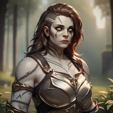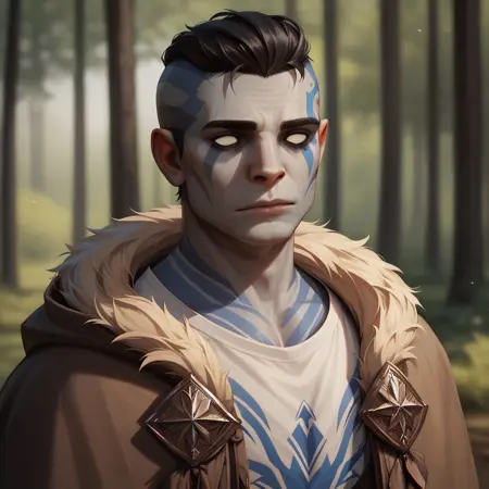 例: goliath, empty eyes, gray skin, stone skin, body tattoo, face tattoo, 1male, blue eyes, green cape