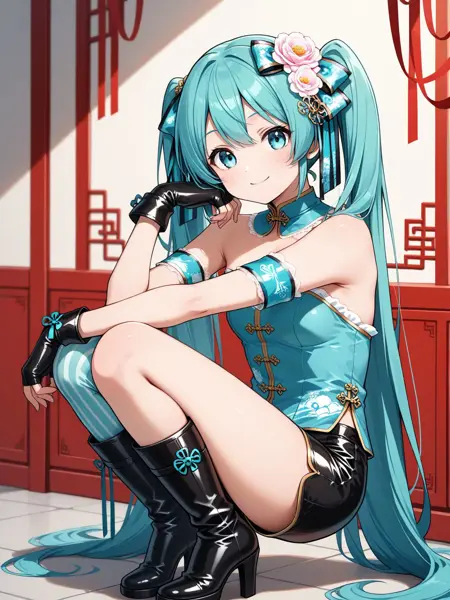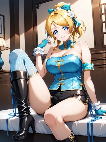 erichina,armband,gloves,fingerless gloves,chinese clothes,hair flower,hair ornament,ribbon,hair bow,hair ribbon,bow,shorts,black shorts,short shorts,latex shorts,bare shoulders,detached collar,blue shirt,strapless,single thighhigh,striped,striped thighhighs,vertical-striped thighhighs,boots,knee boots,high heels,high heel boots,black footwear,